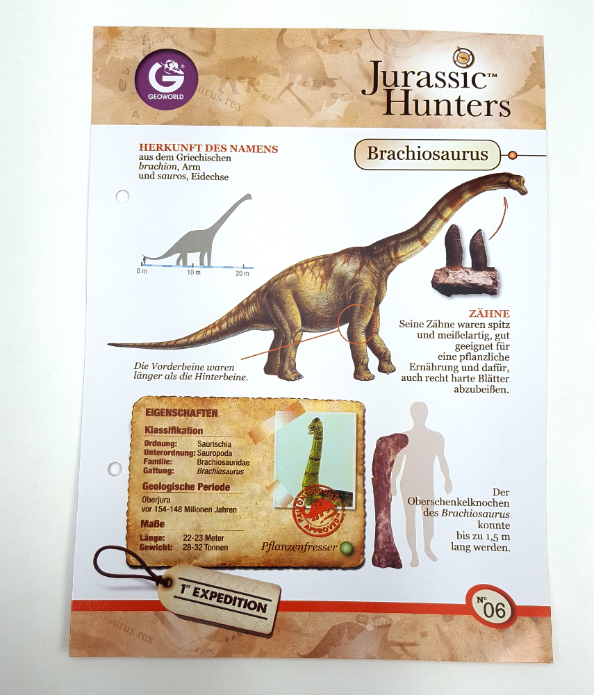 Brachiosaurus war ein großer Sauropode der im Jura – vor rund 161 – 145 Millionen Jahren – im heutigen Nordamerika lebte. Dieser Pflanzen fressende Dinosaurier wurde ca. 25 m lang und schätzungsweise bis zu 38 Tonnen schwer. Mit seinem langen Hals konnte Brachiosaurus die Baumkronen in bis zu 14 m Höhe abweiden.
