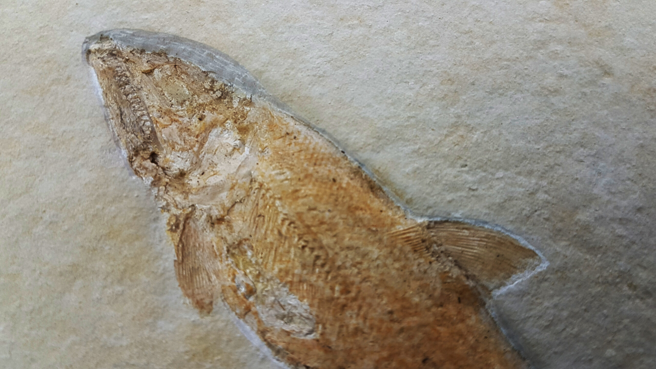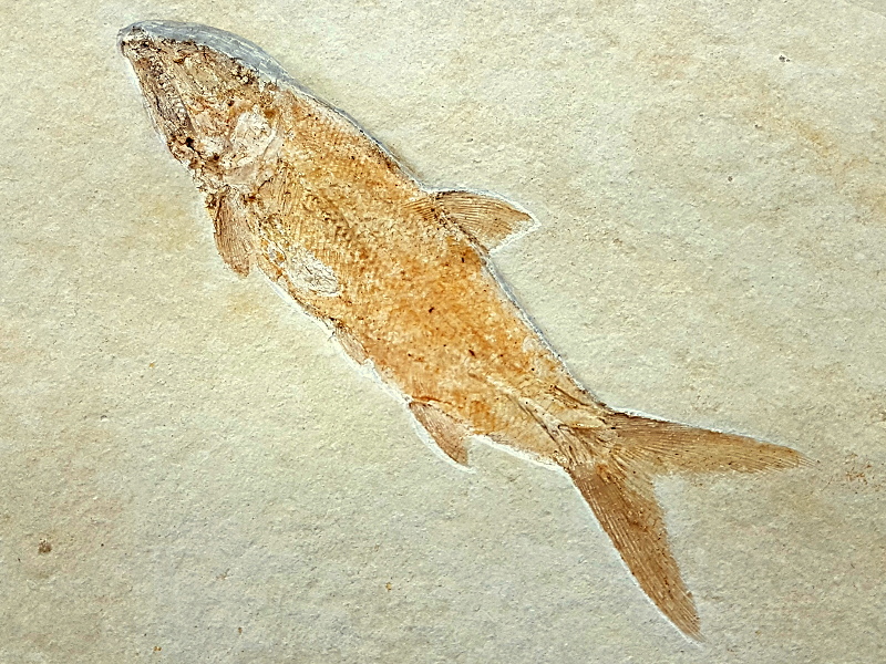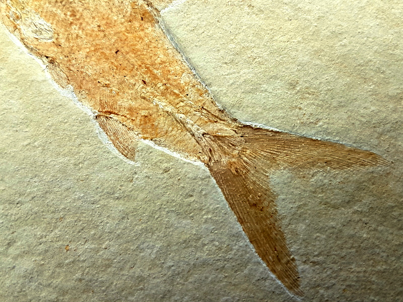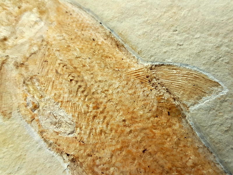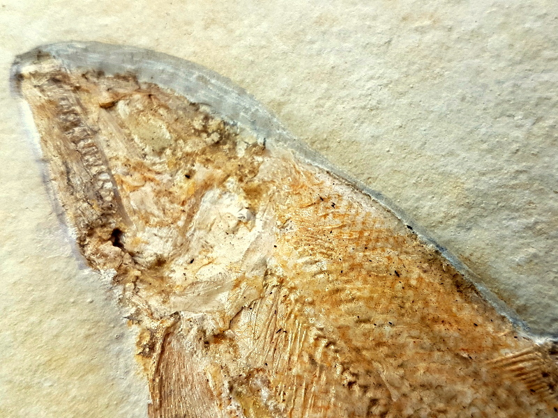 Dieses Fossil aus dem Solnhofener Plattenkalk ist sehr gut erhalten. Sehr schön kann man hier die Zähne, Schuppen und einige Gräten erkennen, selbst die feinen Flossenstrahlen sind gut zu erkennen.