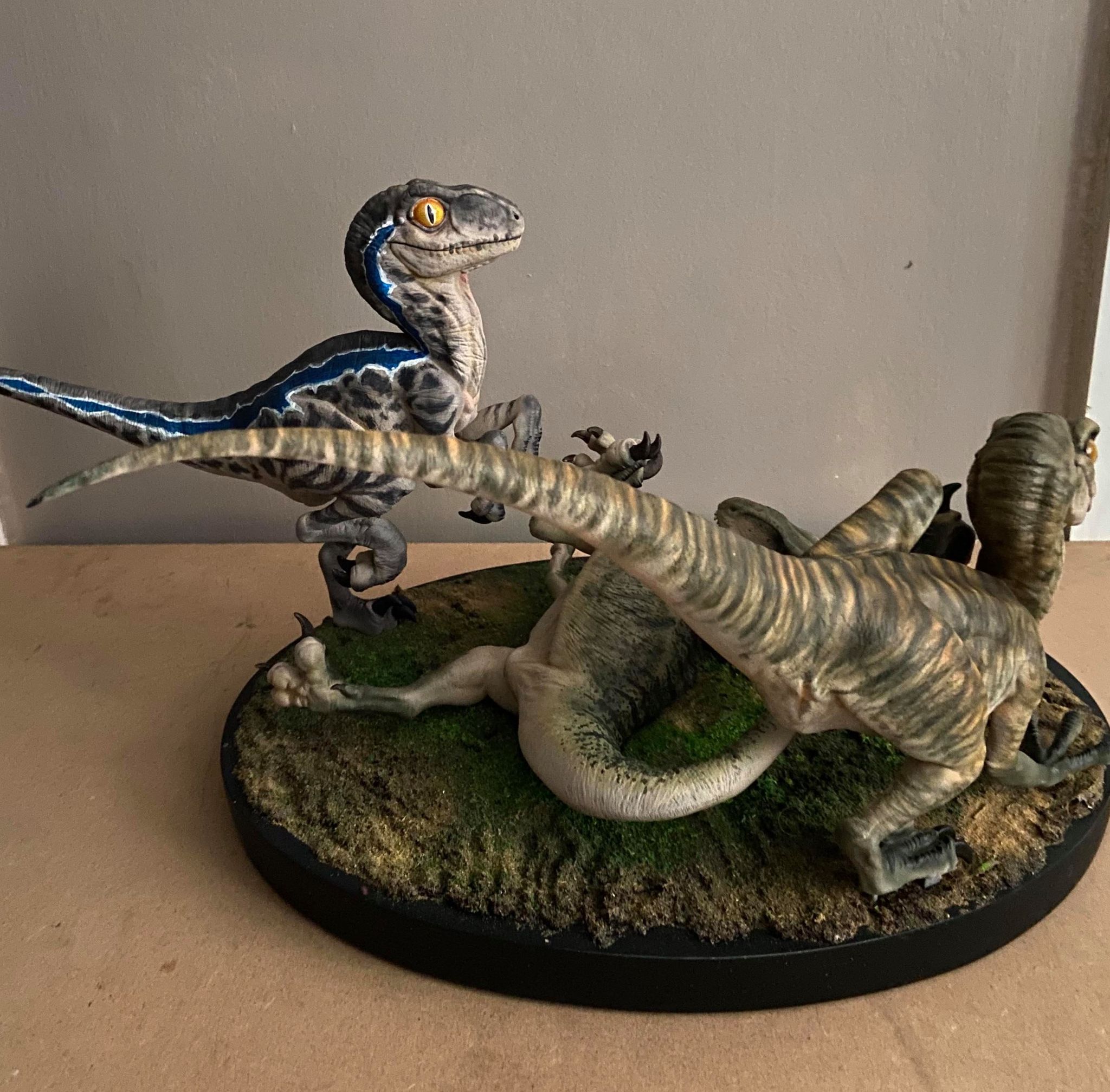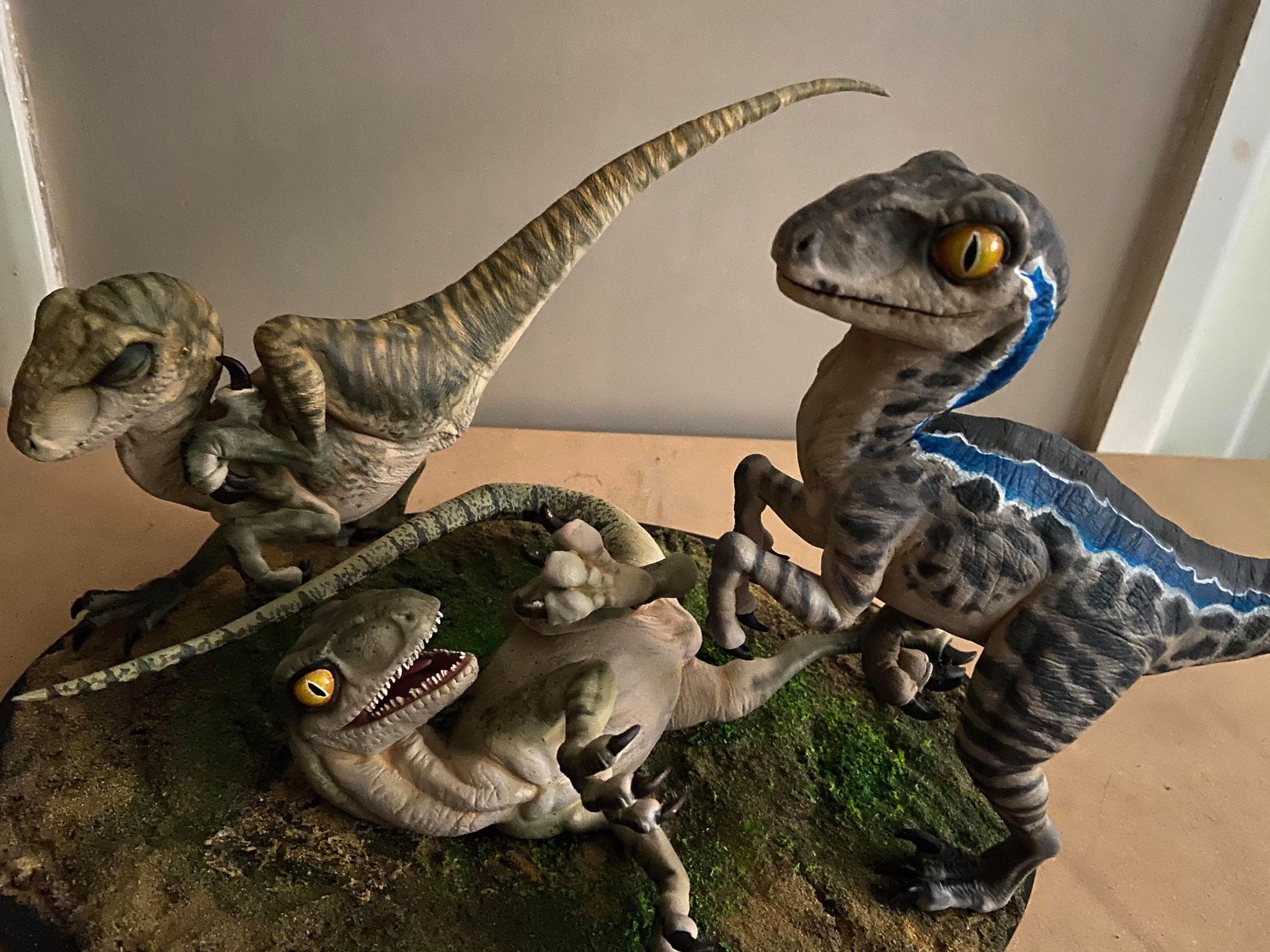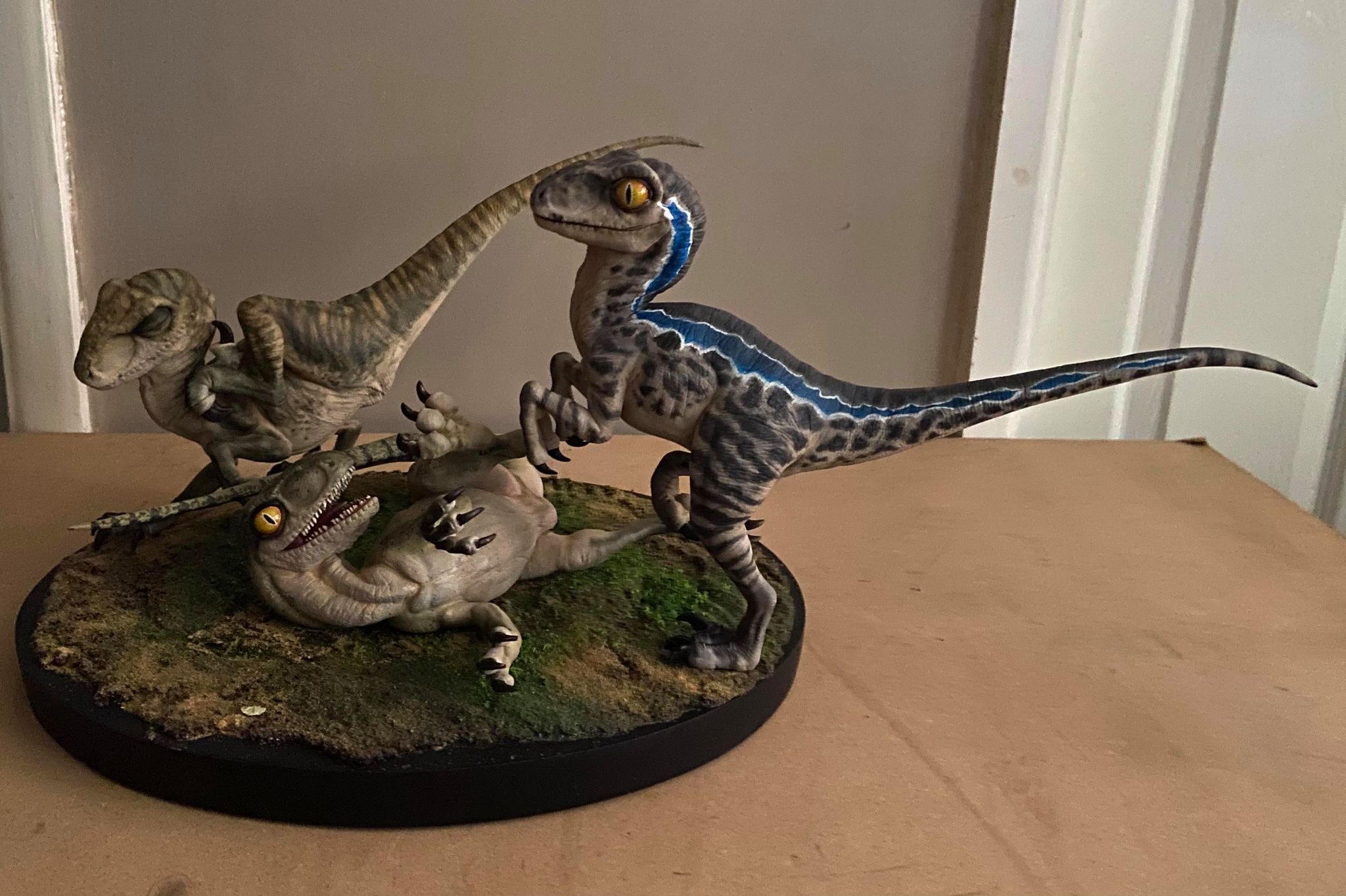 Dieses Diorama wurde von Martin Garratt neu koloriert, außerdem wurde die Base aufgepeppt. Die spielenden Raptoren aus dem Film Jurassic World haben als Farbvorlage gedient.