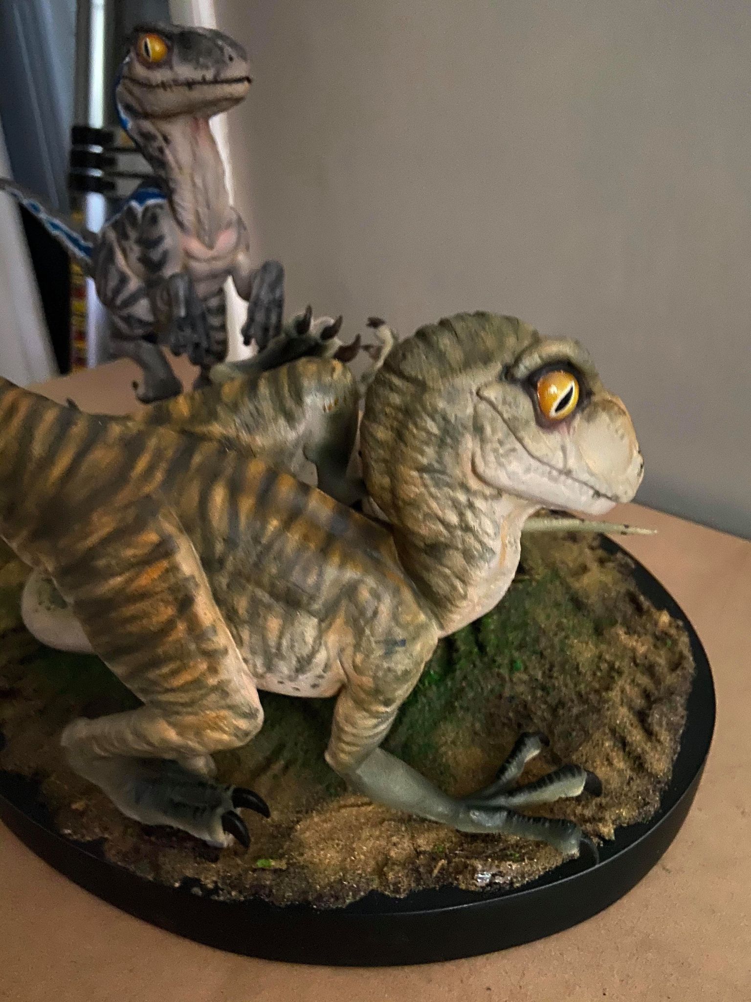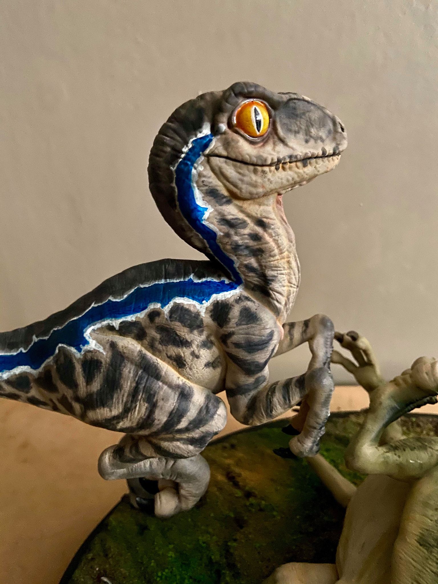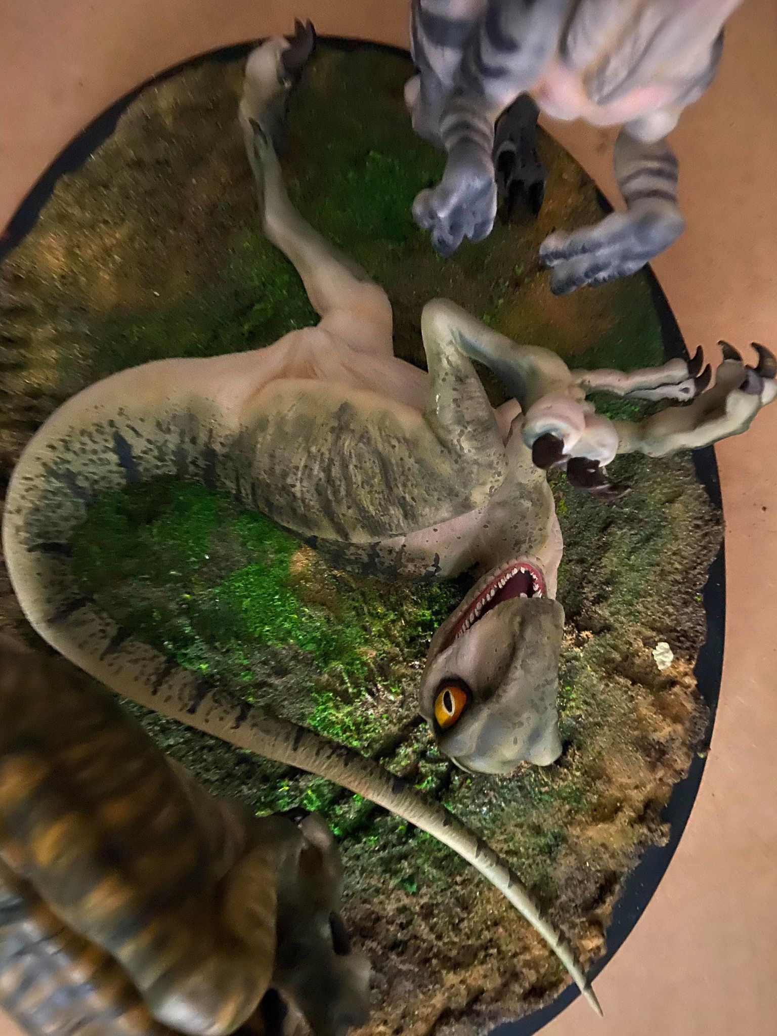 Dieses Diorama wurde von Martin Garratt neu koloriert, außerdem wurde die Base aufgepeppt. Die spielenden Raptoren aus dem Film Jurassic World haben als Farbvorlage gedient.