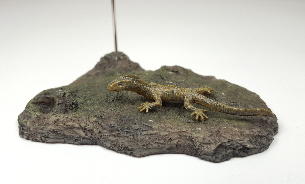 Die Beute, in Form einer kleinen urzeitlichen Echse, sitzt unten auf der Bodenplatte.