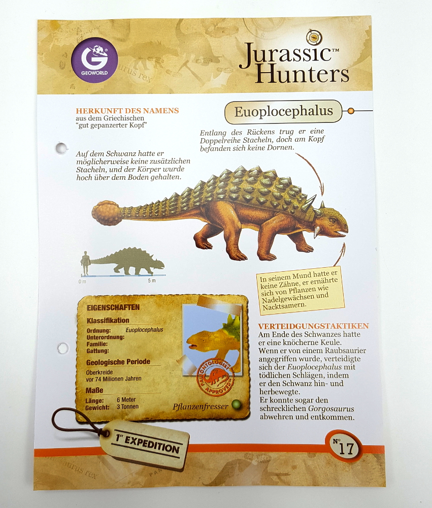 Euoplocephalus gehörte zur Gruppe der Ankylosaurier, er lebte während der Oberen Kreidezeit vor rund 83 – 65 Millionen Jahren in Nordamerika. Er war ein gut gepanzerter Pflanzen fressender Dinosaurier der mit seinem keulenbewährten Schwanz heftige Hiebe austeilen konnte.