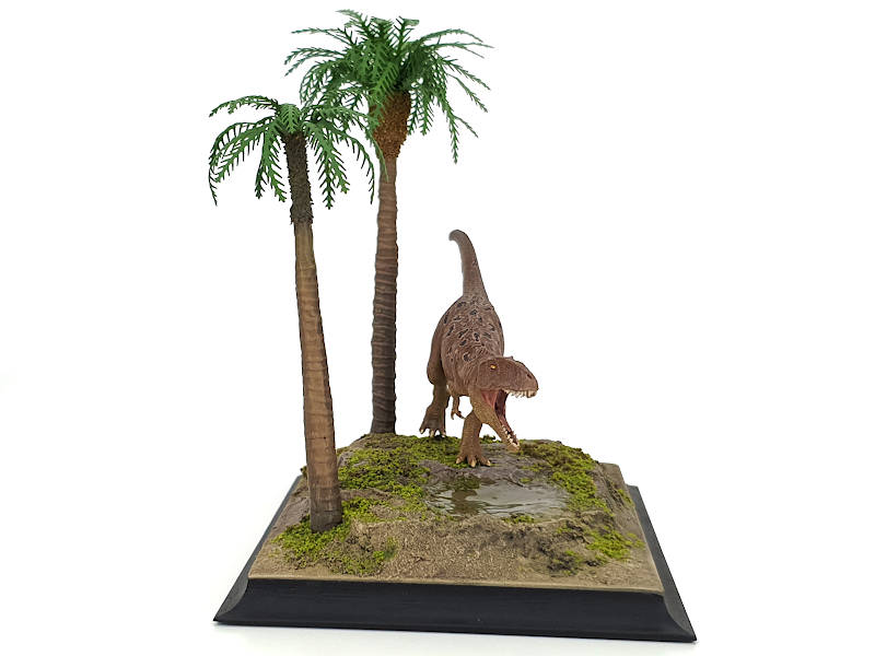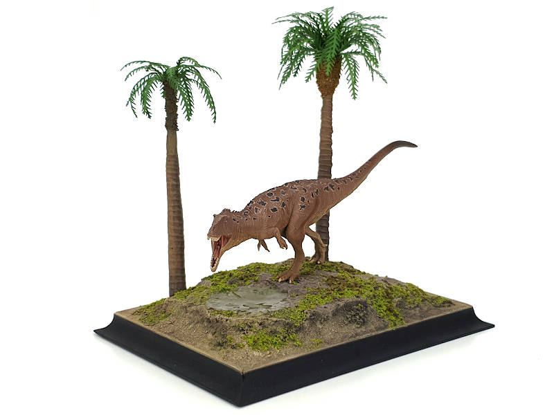 Die Figur und die beiden Palmen sind nicht fest mit dem Sockel verbunden. Der Giganotosaurus steht mittels eines Drahtes im Fuß, der in das dafür vorgesehen Loch eingesteckt wird. Die Palmen müssen in die Löcher reingedrückt werden.