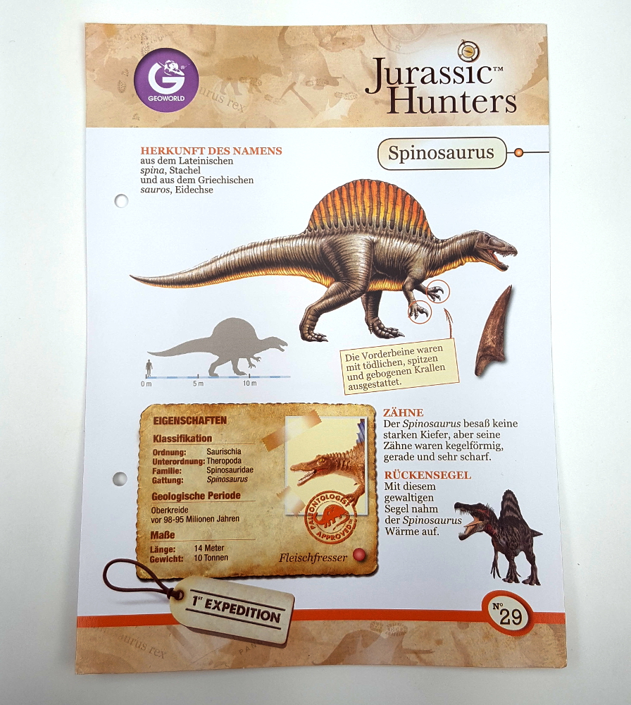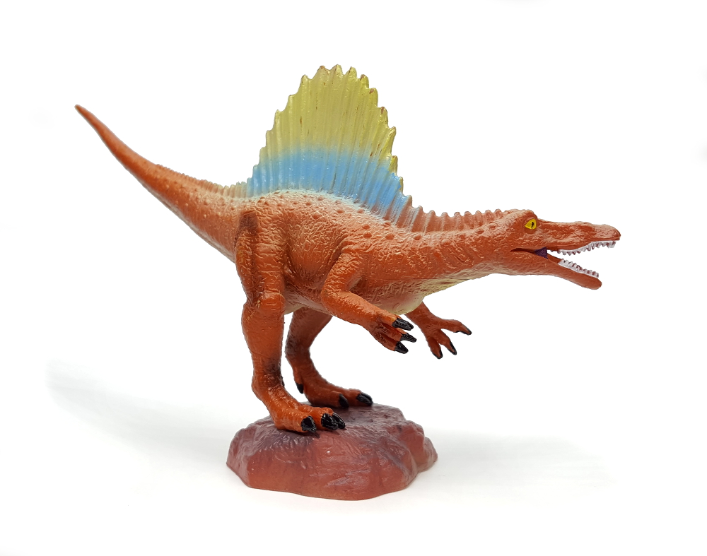 Spinosaurus lebte während der Kreidezeit, vor rund 100 Millionen Jahren, in Afrika und war mit ca. 16 – 18 Metern Länge und einem Gewicht zwischen 7 und 9 Tonnen der größte bekannte Fleisch fressende Dinosaurier. Sein langer krokodilähnlicher Schädel spricht dafür, dass er sich auf die Jagd nach Fischen spezialisiert hatte. Auf dem Rücken trug der Spinosaurus, wahrscheinlich, ein bis zu 2 Meter großes Segel. Die urzeitliche Echse könnte so ihren Temperaturhaushalt reguliert haben. Andere Wissenschaftler spekulieren ob diese langen Dornfortsätze auf den Rückenwirbeln einen Höcker gestützt haben.