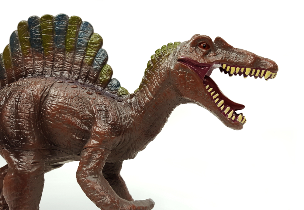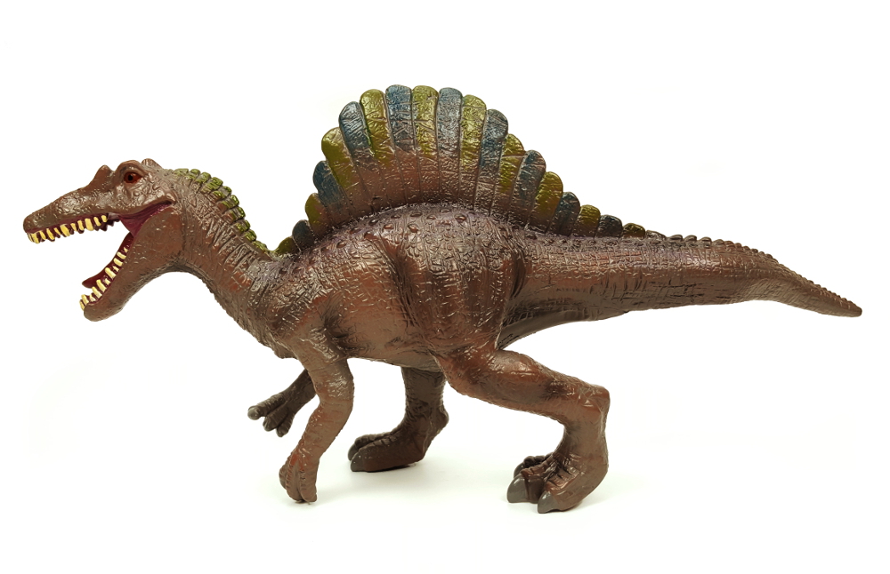 Diese recht große und schön detaillierte Spielzeug-Figur eines Spinosaurus ist handbemalt.