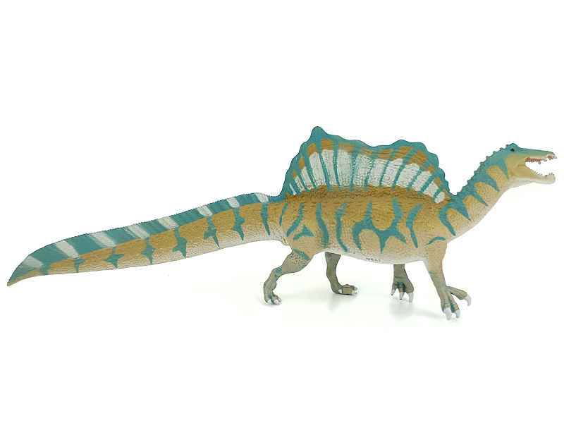 Spinosaurus lebte während der Kreidezeit, vor rund 100 Millionen Jahren, in Afrika und war, mit ca. 14 – 17 Metern Länge, ein sehr großer Räuber. Sein langer krokodilähnlicher Schädel spricht dafür, dass er sich auf die Jagd nach Fischen spezialisiert hatte. Auf dem Rücken trug der Spinosaurus, wahrscheinlich, ein bis zu 2 Meter großes Segel. Die urzeitliche Echse könnte so ihren Temperaturhaushalt reguliert haben. Andere Wissenschaftler spekulieren ob diese langen Dornfortsätze auf den Rückenwirbeln einen Höcker gestützt haben.