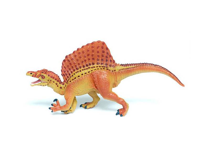 Spinosaurus lebte in Afrika und war, mit ca. 15 Metern Länge, ein sehr großer Fleisch fressender Dinosaurier. Sein langer krokodilähnlicher Schädel spricht dafür, dass er sich auf die Jagd nach Fischen spezialisiert hatte. Auf dem Rücken trug der Spinosaurus, wahrscheinlich, ein bis zu 2 Meter großes Segel. Die urzeitliche Echse könnte so ihren Temperaturhaushalt reguliert haben. Andere Wissenschaftler spekulieren ob diese langen Dornfortsätze auf den Rückenwirbeln einen Höcker gestützt haben.