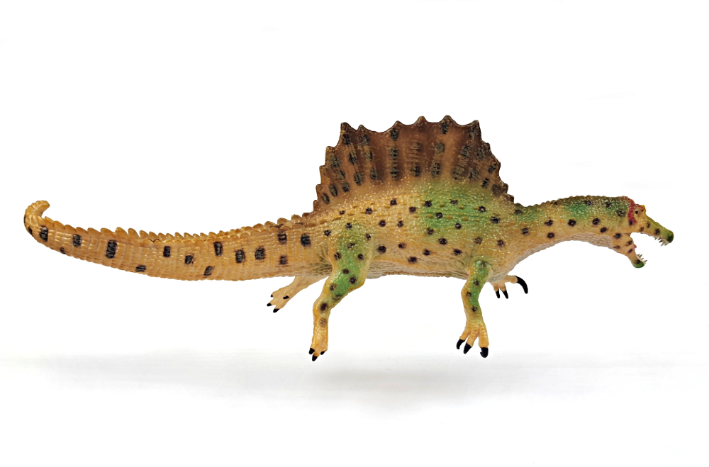 Spinosaurus lebte während der Kreidezeit, vor rund 100 Millionen Jahren, in Afrika und war mit ca. 16 – 18 Metern Länge und einem Gewicht zwischen 7 und 9 Tonnen der größte bekannte Fleisch fressende Dinosaurier. Sein langer krokodilähnlicher Schädel spricht dafür, dass er sich auf die Jagd nach Fischen spezialisiert hatte. Auf dem Rücken trug der Spinosaurus, wahrscheinlich, ein bis zu 2 Meter großes Segel. Die urzeitliche Echse könnte so ihren Temperaturhaushalt reguliert haben. Andere Wissenschaftler spekulieren ob diese langen Dornfortsätze auf den Rückenwirbeln einen Höcker gestützt haben.